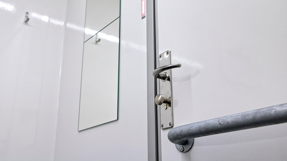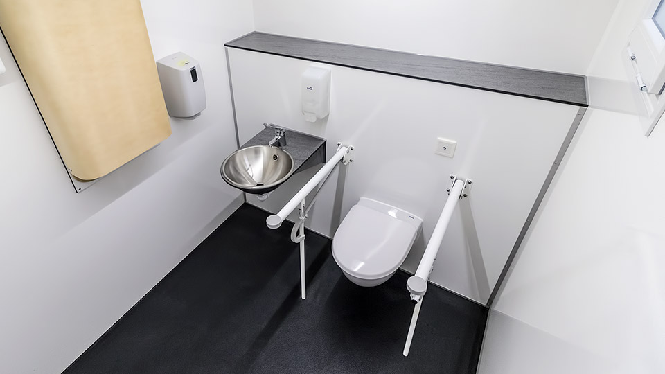 The accessible toilet has an extra large room with a wide door and an aluminium ramp. The room contains toilet safety rails with support legs, a one arm faucet, a changing table and an alarm button that notifies personel on site via the built in IOT sensor and by flashing the exterior lights. The 320 model also contains an easy access shower.