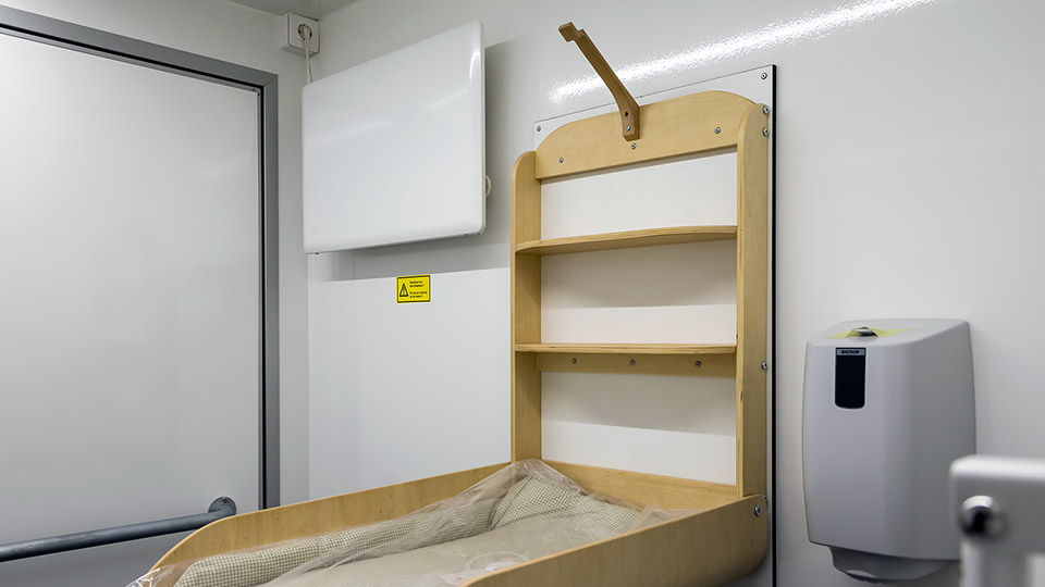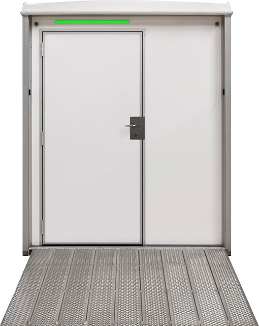 The accessible toilet has an extra large room with a wide door and an aluminum ramp. The room contains toilet safety rails with support legs, a one arm faucet, a changing table and an alarm button that notifies the staff on site via the built in IOT sensor and by flashing the exterior lights. The 320 model also contains an easy access shower.
