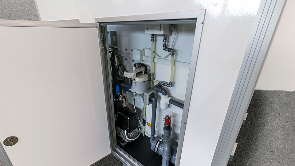 With its built in pump it can be located separately from high capacity toilets which require a pump station.