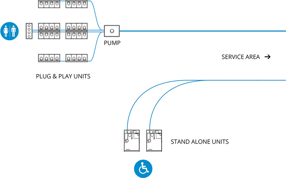 All stand alone units come with a built in pump that can transport wastewater directly into an off-site tank or sewer. Additionally, many units also feature a water supply tank and sewage tank. The units can therefore be placed separately from high capacity toilets that rely on a dedicated pump station for maximum efficiency. It gives rental operators and event organizers the ability to place units in isolated areas, for example backstage and easy access zones. If you have any questions feel free to contact us.
