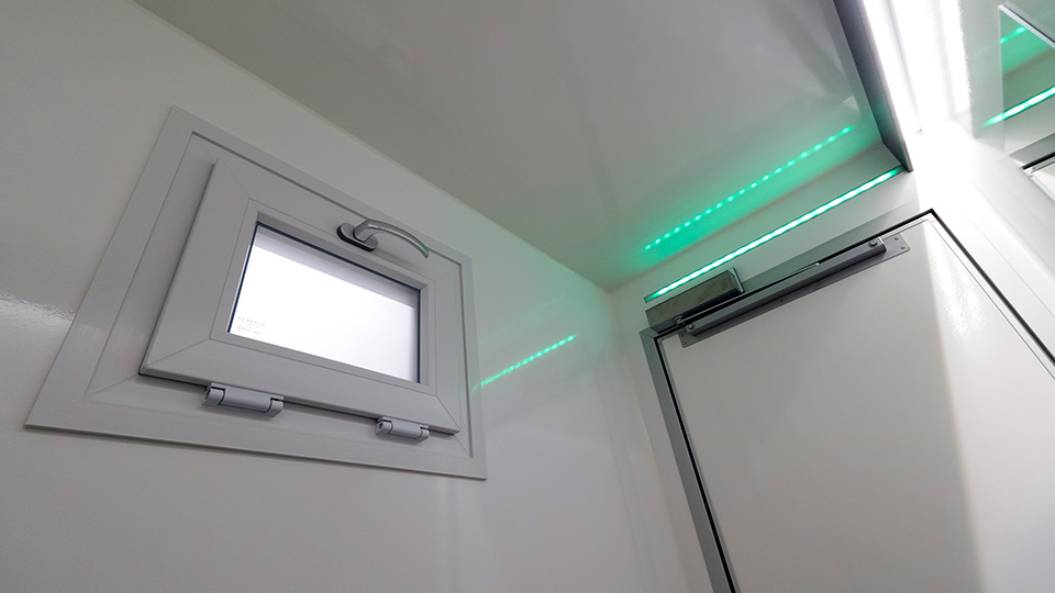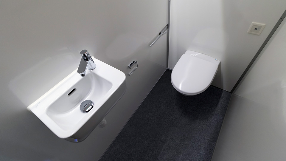 EventCubes are built strictly from inorganic materials to protect against damp, mold and degradation over time. The inside consists of fiberglass with a hidden pipe feed and wall-mounted fittings, giving the user a feeling of cleanliness and comfort. The smooth surfaces and obstacle-free floor can be cleaned quickly and efficiently.
