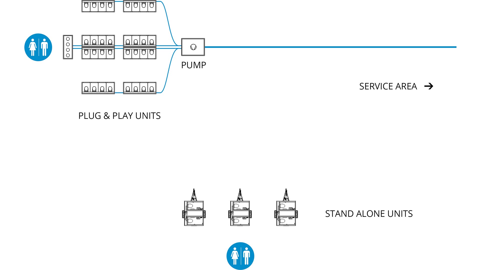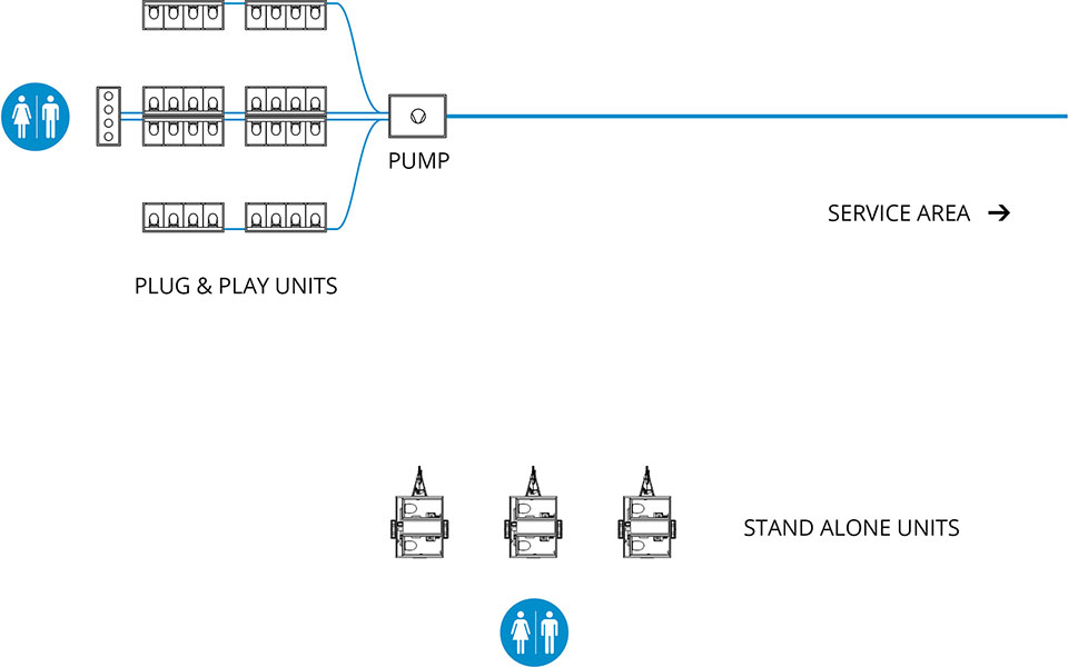 All stand alone units come with a built in pump that can transport wastewater directly into an off-site tank or sewer. Additionally, many units also feature a water supply tank and sewage tank. The units can therefore be placed separately from high capacity toilets that rely on a dedicated pump station for maximum efficiency. It gives rental operators and event organizers the ability to place units in isolated areas, for example backstage and easy access zones. If you have any questions feel free to contact us.