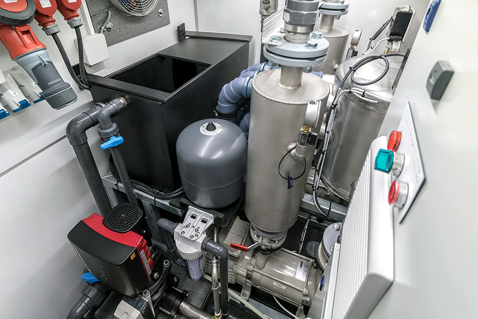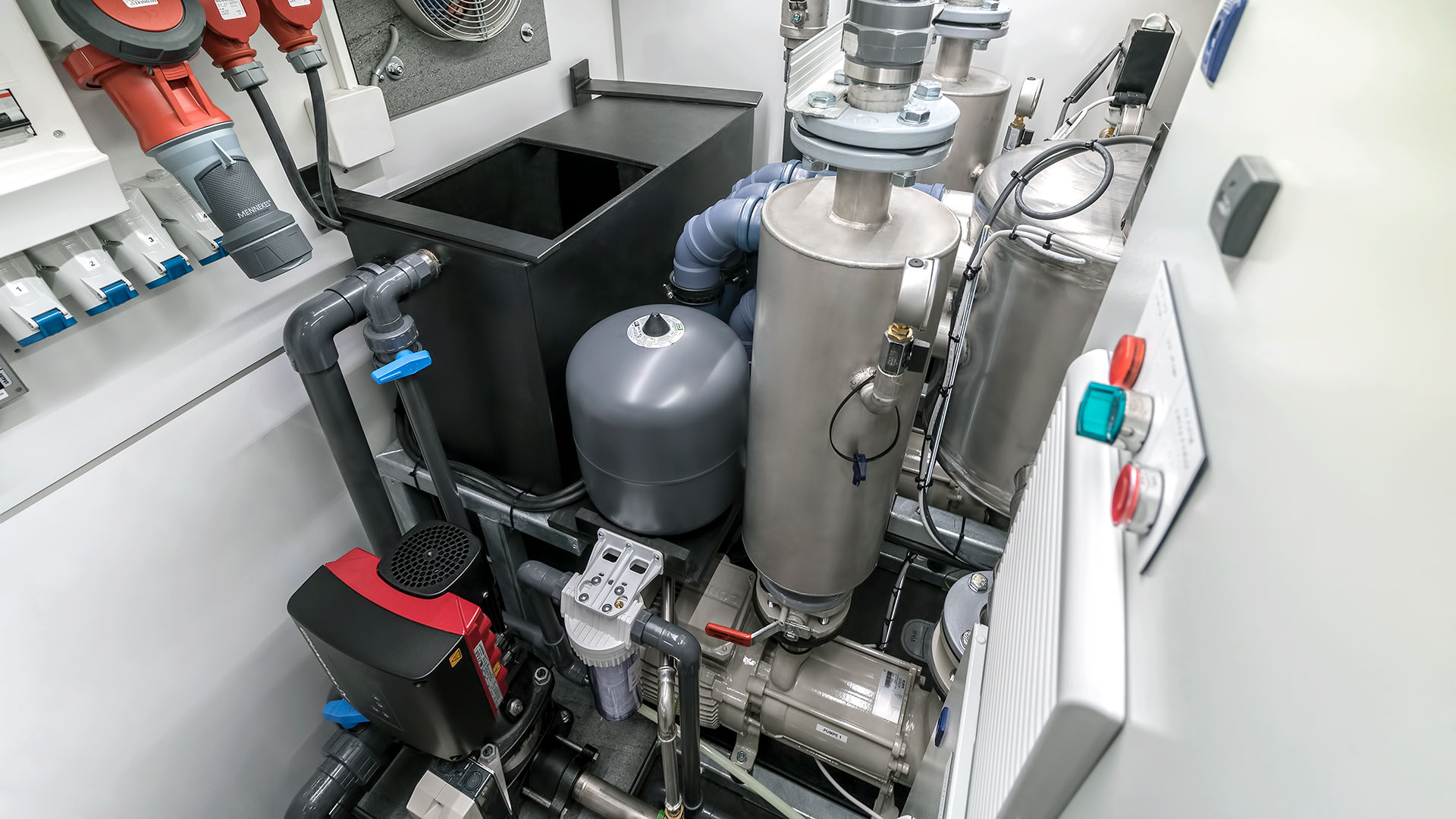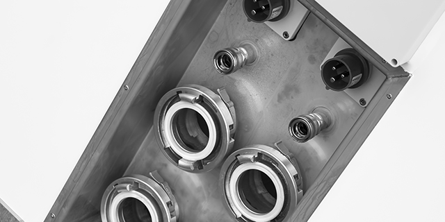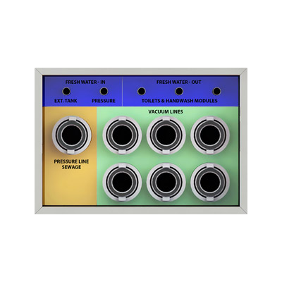 The pump station works like a connection hub between all sanitation units. It distributes water supply, vacuum lines and power. Having all electrical installations in a single unit reduces the need for service and maintenance. It connects to other units via colored couplings.
